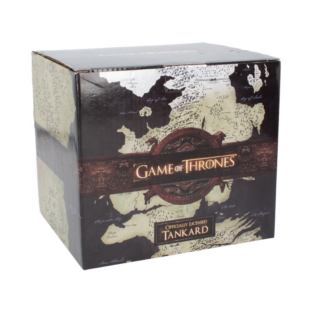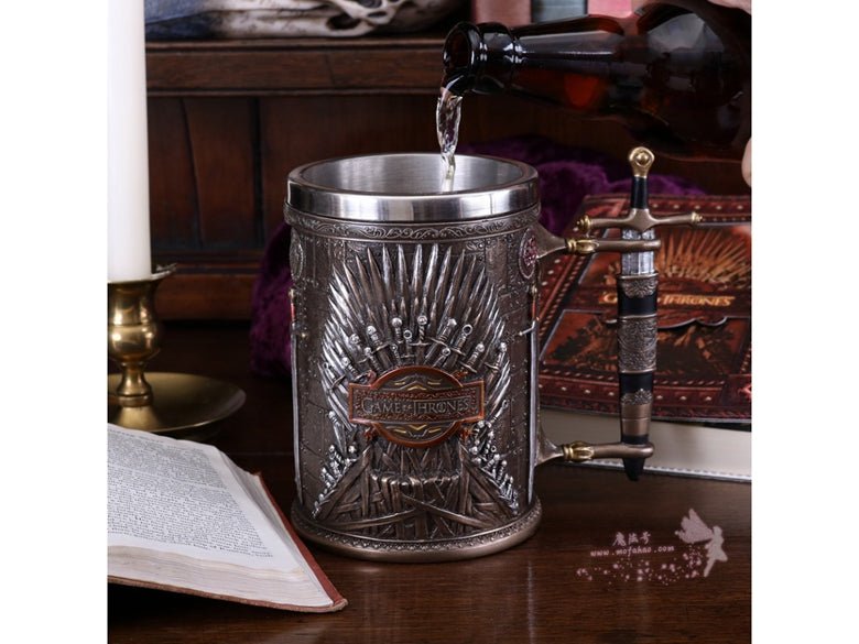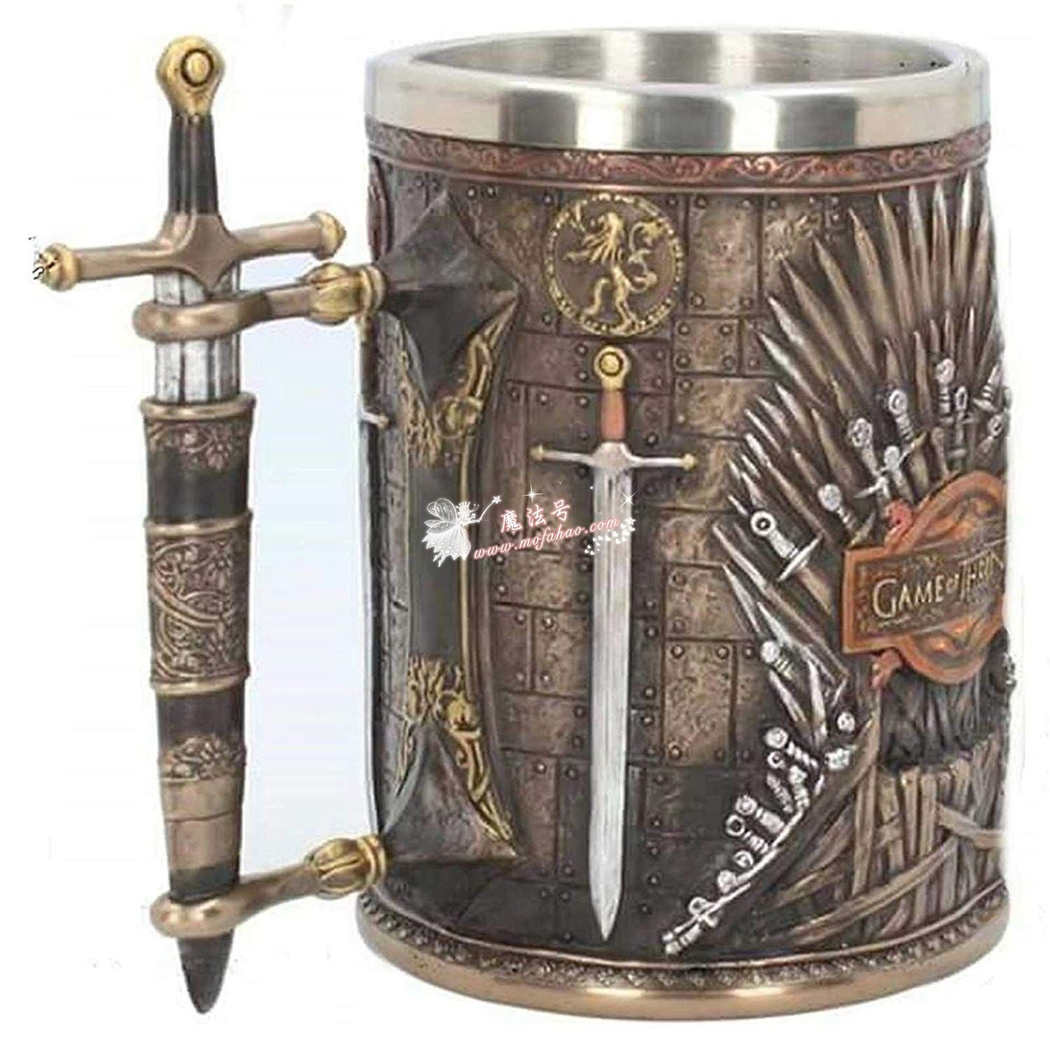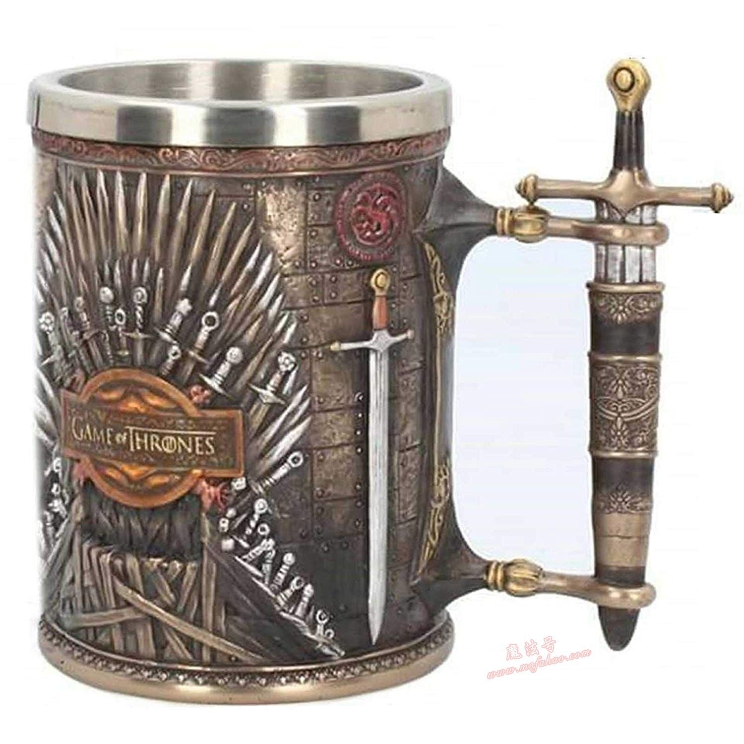 杯的柄是一把剑从鞘中滑出来,准备击剑。每一方都有一张极其壮观的钢铁王座的图片,里面有王权游戏的标志。它们彼此分开,手柄由无鞘的剑指向下方,每个剑上面都有一个房子的印记——兰尼斯特、塔格里扬或斯塔克。