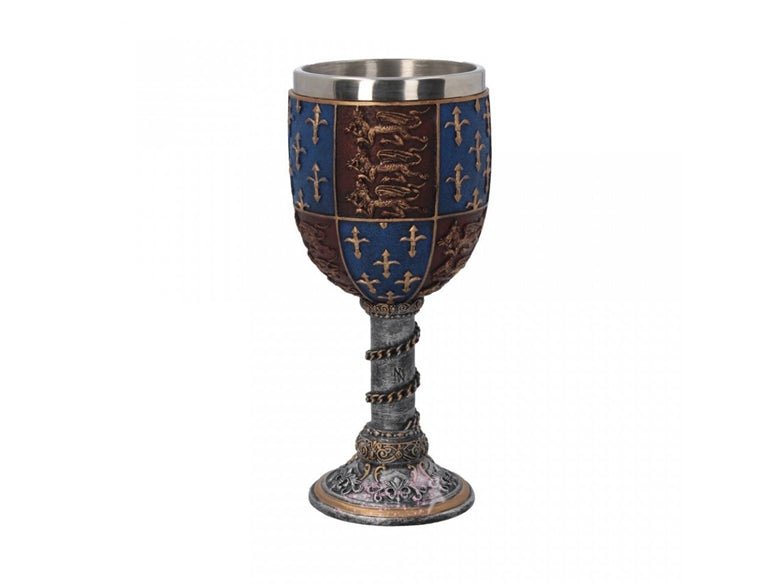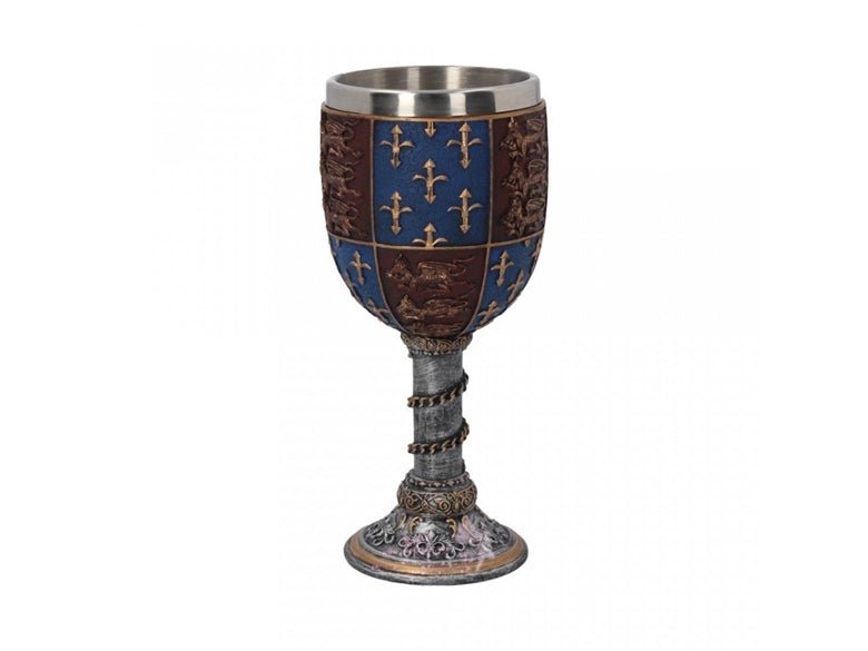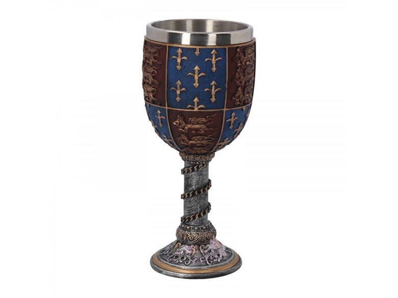高脚杯的主体具有爱德华三世皇家标准的重复图案,在红色的场地上有3只金狮子,在蓝色的田野上排列着金色的鸢尾花图案。