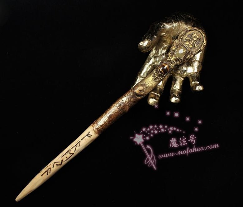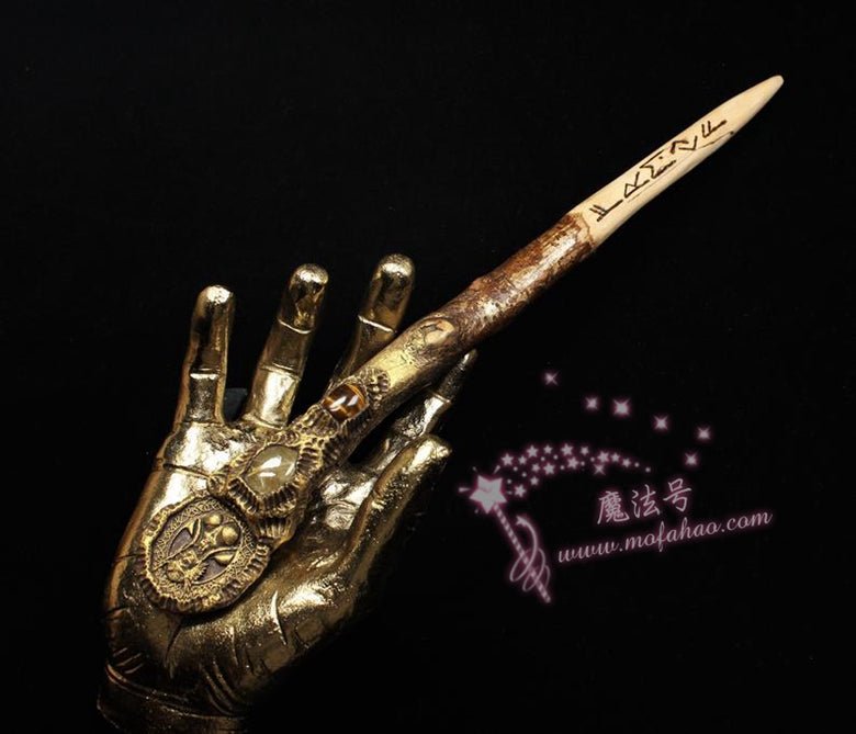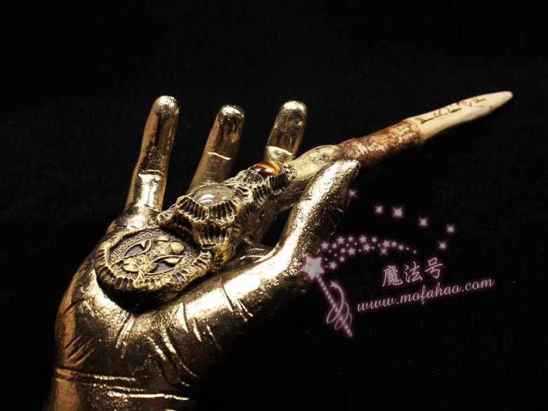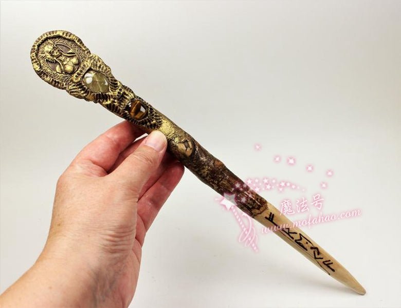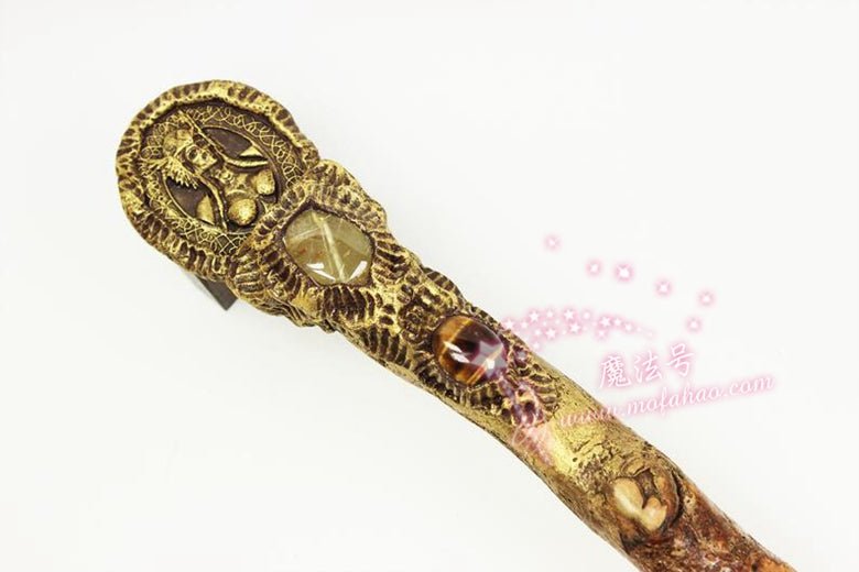 弗雷亚女神魔杖-一个美丽的手工制作桦木魔杖献给挪威女神弗雷亚。魔杖上镶嵌着一块美丽的金色发红石英水晶和一块金色虎眼水晶,水晶上刻有符文符号,上面写着“弗雷亚”的名字。