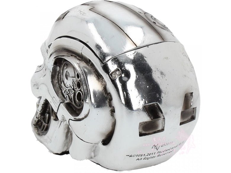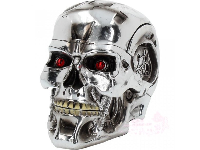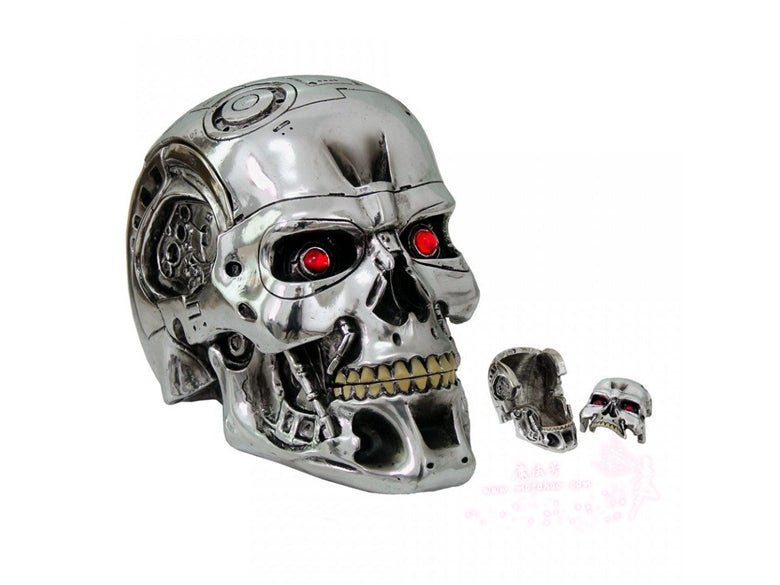 这个T-800终结者的头已经脱落了所有的人肉,暴露在金属骨骼结构覆盖的液压系统,嘲笑人类。红眼直视前方。