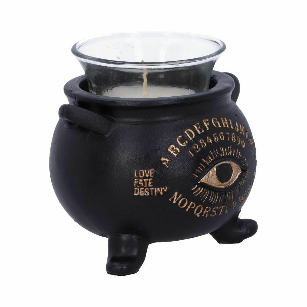 这个小鼎烛台是任何神秘爱好者的梦想。这个坩埚手持一个小玻璃烛台,表面为哑光黑色,中心有一个金色的通视眼。这座大锅上刻有占卜板上的文字和数字,眼睛两侧刻着“爱、命运、命运”和“无所不知、无所不知、无所不知”的字样。在极好的树脂铸造,这件将成为优美的补充任何黑暗的祭坛尺码-9厘米高
