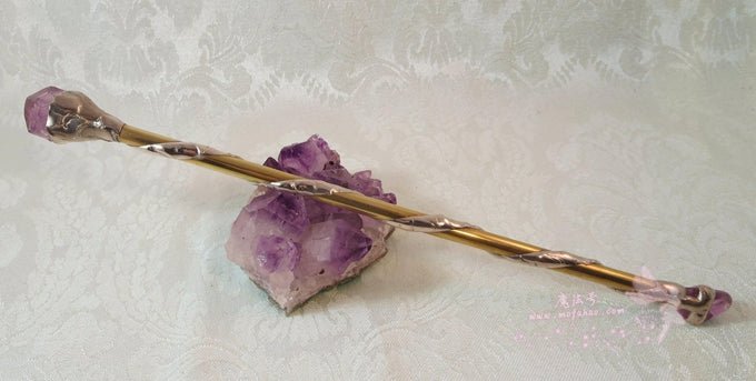 这款强大的手工魔杖一端有一个紫水晶水晶点,另一端有一个翻滚的紫水晶。