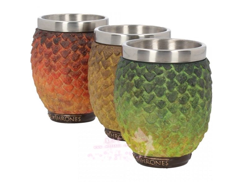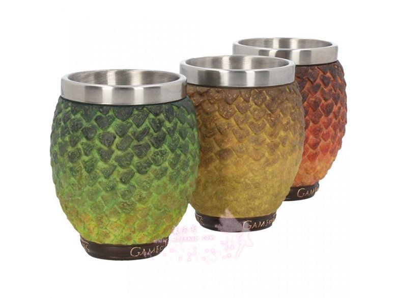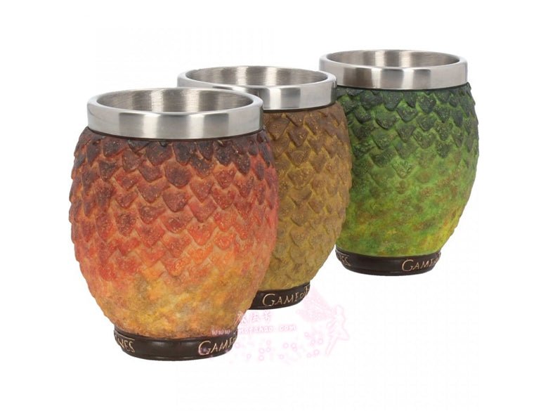 这款神奇的Dragon Egg龙蛋树脂杯可以独家提供适合Khaleesi的礼物。这些小酒杯以3件套的形式模仿了孵化成Drogon,Viserion和Rhaegal的龙蛋,一个红色,一个绿色和一个黄色。在它们遇见标有“权力的游戏”标志的棕色基地之前,鳞片向底部变浅,呈浅黄色。在顶部,可拆卸不锈钢插件的边缘出现。这些镜头玻璃采用优质的树脂铸造,然后经过精心手绘,这些镜头玻璃采用专门设计的木制展示盒,标有Targaryen龙 – 镜像Magister Illyrio使用的盒子将蛋呈现给丹妮莉丝。