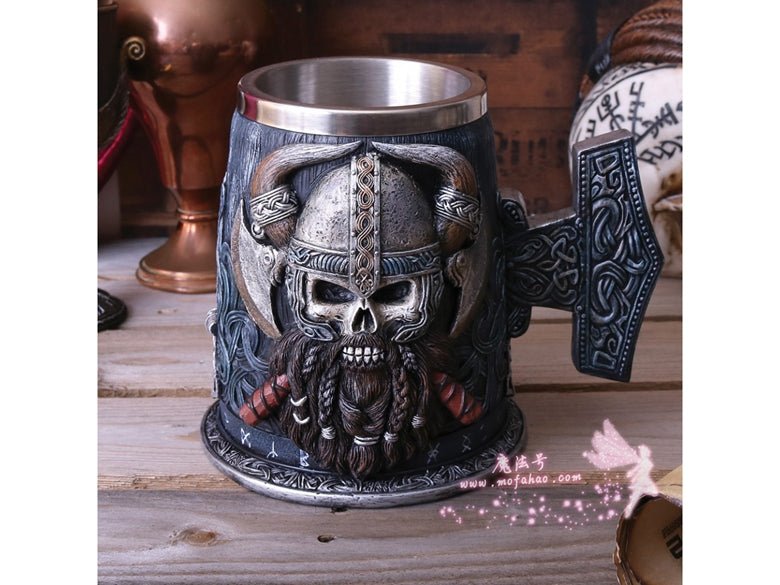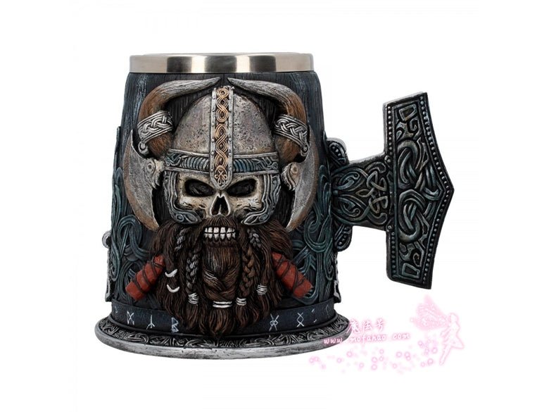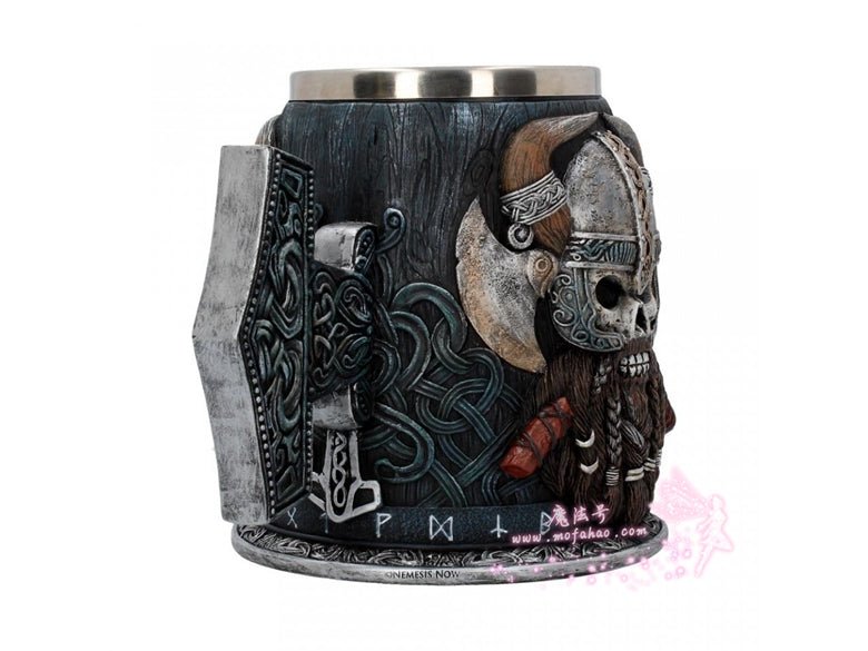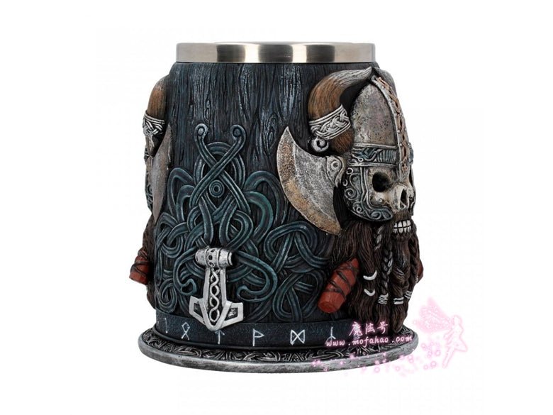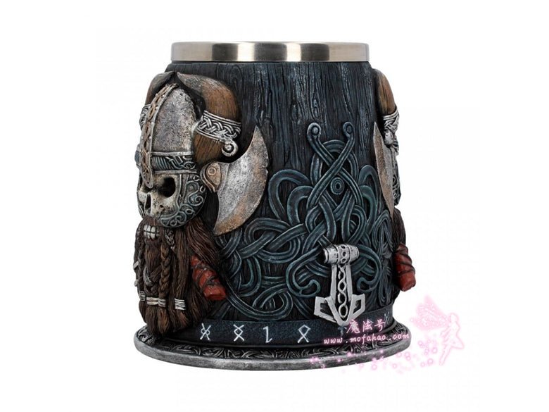用丹格尔德来表达你的敬意,这是维京系列的独家产品!这酒杯的黑色杯身似乎是由雕刻的木头制成的,在下半部分缠绕着海盗号结。一圈北欧符文环绕着底部,结的设计延伸到把手形状像mjolnir。在杯的两侧,一个凶猛的海盗头骨向外凝视着2把交叉的战斧,浓密的棕色胡须编成辫子准备战斗。该产品采用优质树脂浇铸而成,并经过专业的手绘处理,配有一个可拆卸的不锈钢插件,便于清洗。