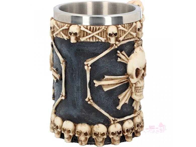 在经过精心的手绘之前,用最好的树脂浇铸而成,这是充满威胁的哥特式酒杯, 这酒杯的底部被朝外的露齿而笑的头骨包围着。在它们的上方,两侧有一个巨大的头骨,位于一个由骨头构成的8角星的中心,并在骨头的边界上环绕。在钢圈下面,交叉的骨头被头骨分开。手柄是三块坚固的骨头,呈曲线状,由球头连接。带一个可拆卸的不锈钢插入易于清洗,这是,任何口渴的巫师一个完美的礼物。