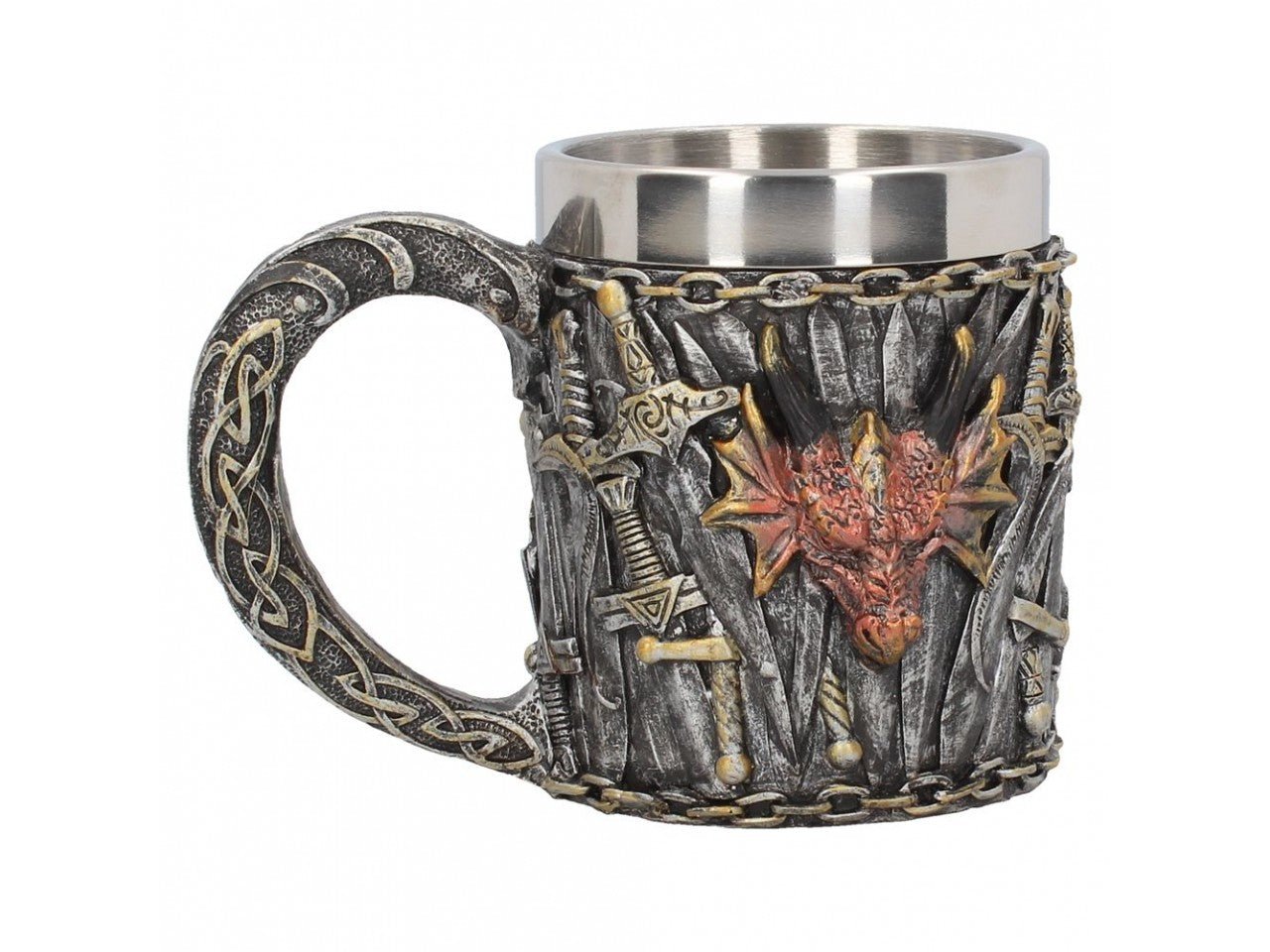 类别:中世纪功能:啤酒杯重量:0.55千克原色:灰色次要颜色:红色材料:树脂/不锈钢嵌件包装:棕色盒子 这个产品是装饰用的。与龙王国酒杯一起喝,酒杯的车身覆盖着大量的剑、钢刃和金柄,顶部和底部由坚固的铁链相连。在酒杯的侧面,一条凶猛的红龙的头像标准一样坐着。灰色手柄采用凯尔特结设计。这款坚固的酒杯采用优质树脂浇铸而成,手绘精美,配有可拆卸不锈钢插件。