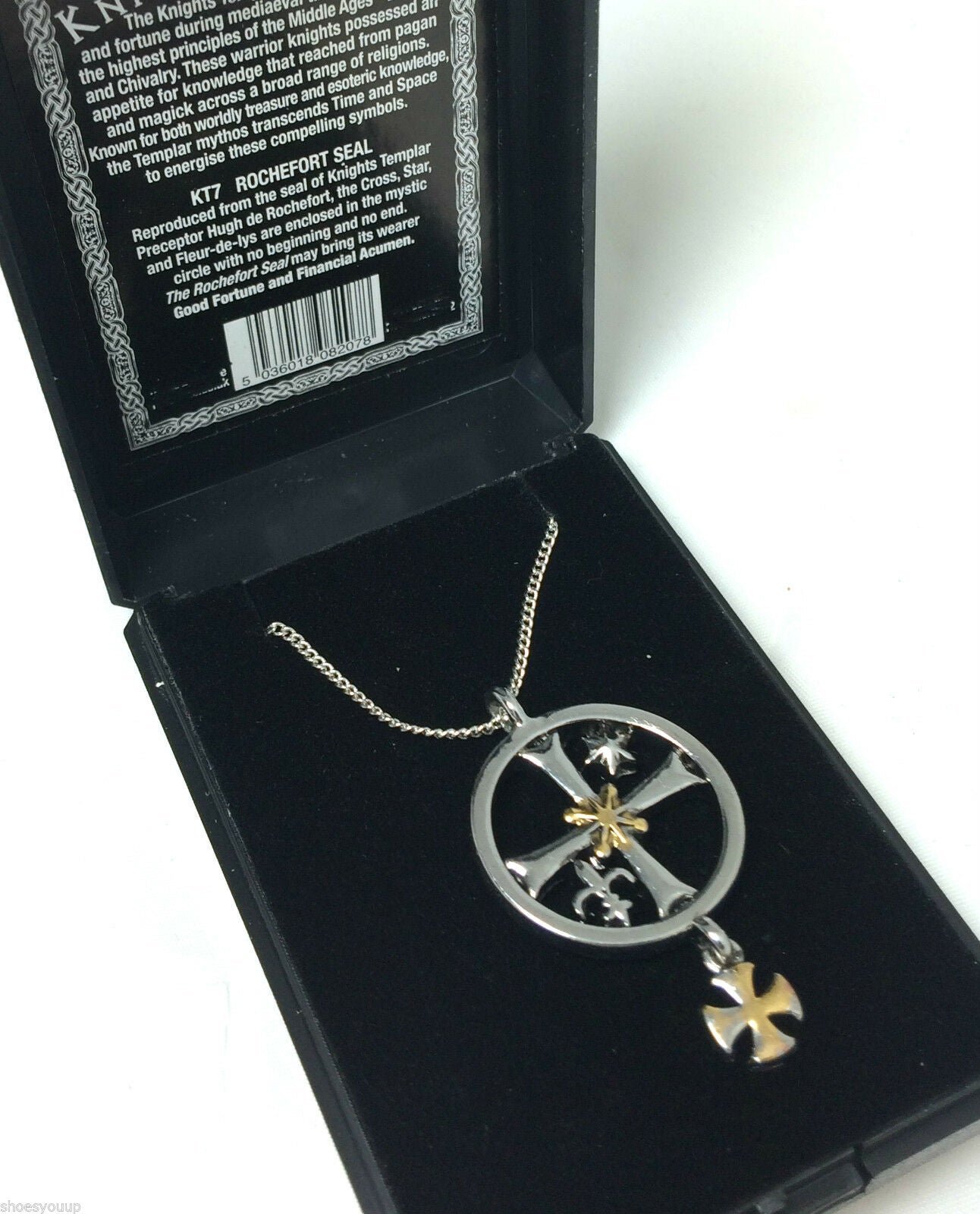 每个吊坠都配有一条项链,并在黑色首饰盒中描述其含义。